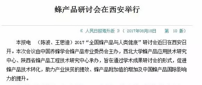 中國(guó)農(nóng)科院蜜蜂所、陜西省林業(yè)廳、西北大學(xué)、浙江大學(xué)及全國(guó)多家知名蜂產(chǎn)品企業(yè)參加會(huì)議,多名專家學(xué)者闡述了最新的蜂產(chǎn)品科研技術(shù)成果報(bào)告。陜西省林業(yè)廳廳長(zhǎng)李三原表示,這些科研技術(shù)成果意義重大,部分技術(shù)應(yīng)用到精準(zhǔn)扶貧工作中后,預(yù)計(jì)能使養(yǎng)蜂脫貧的貧困戶收入翻番。